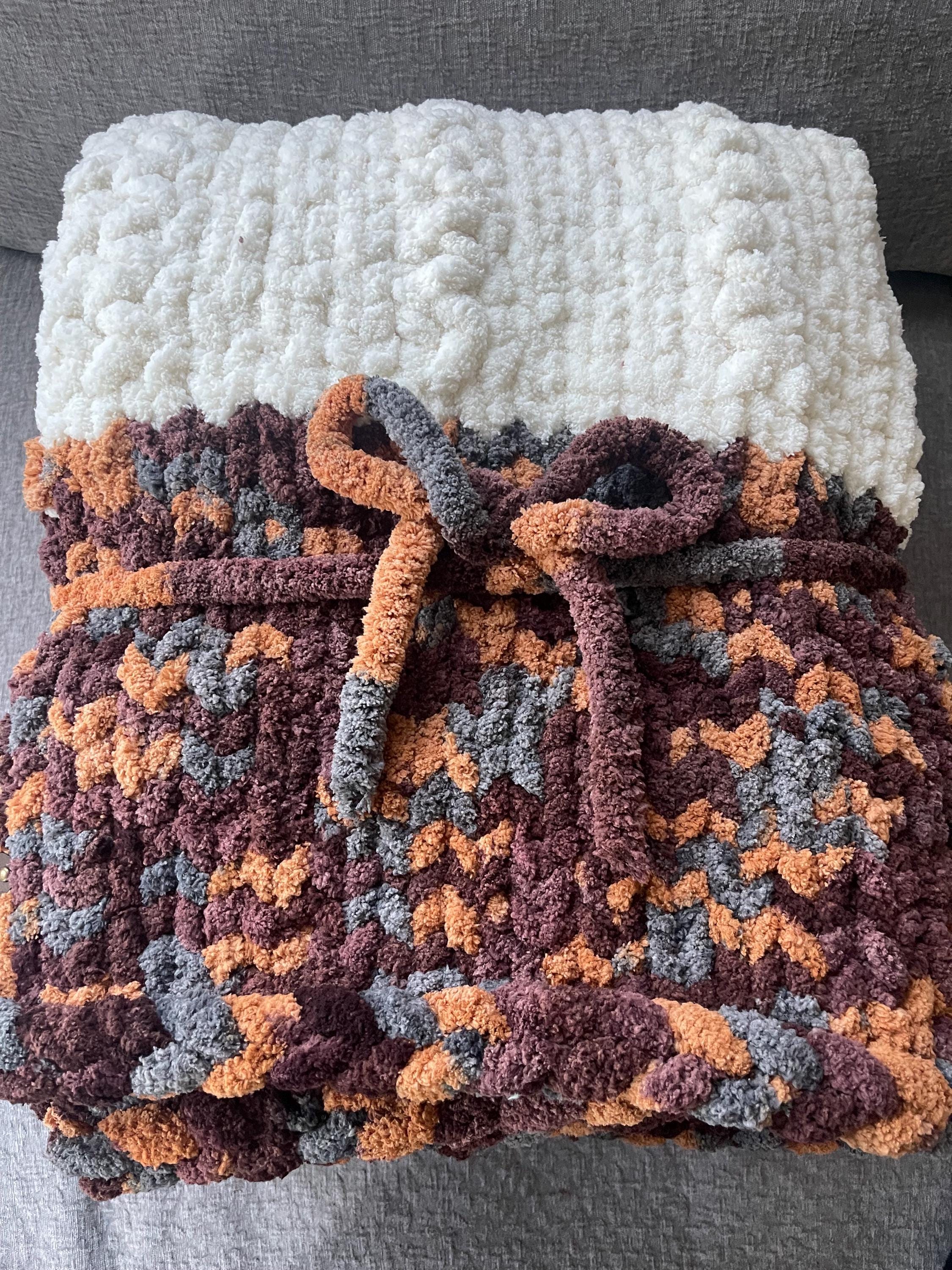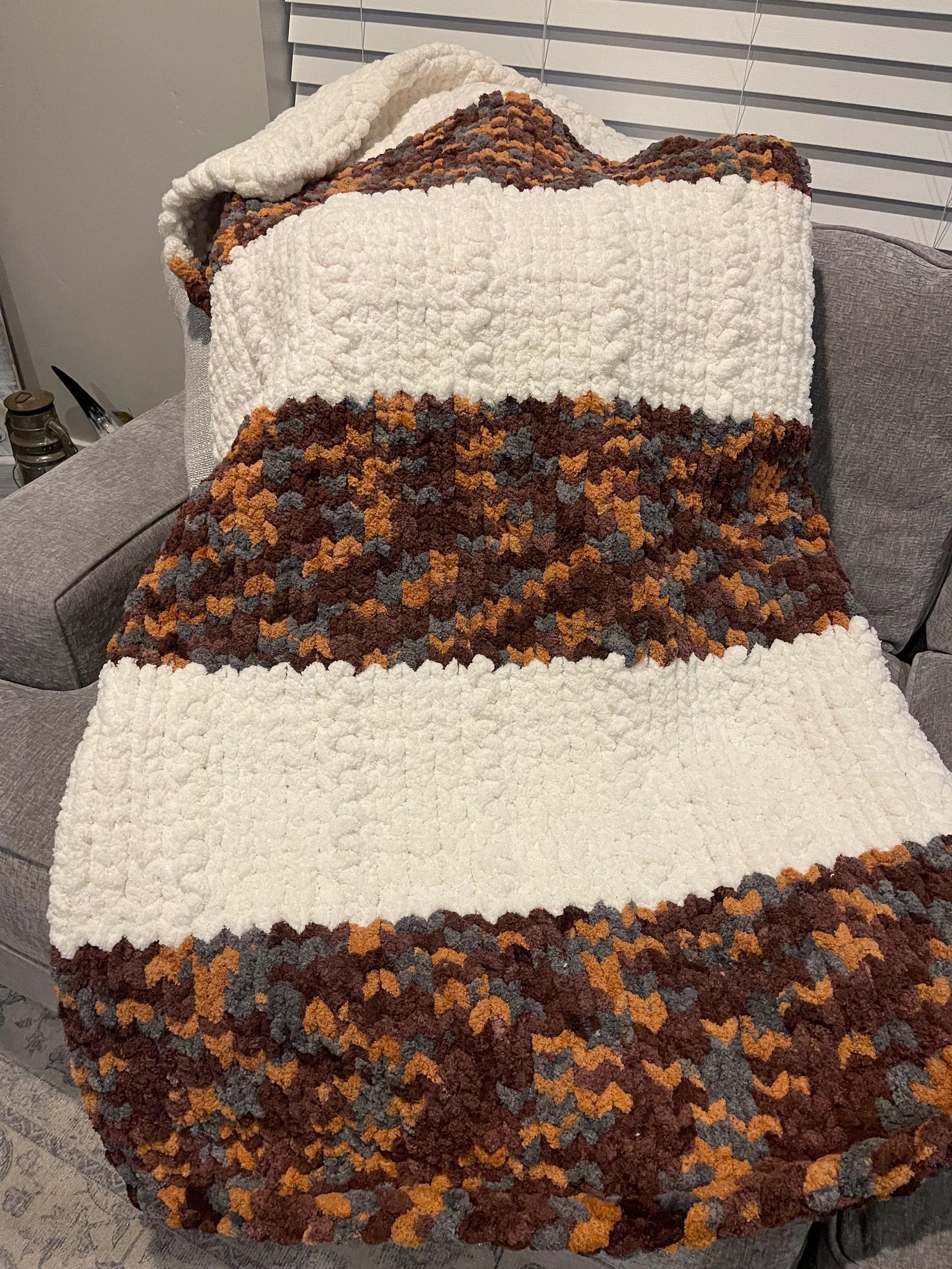 Handmade with plush, ultra-soft yarn in rich autumn tones of cream, rust, golden ochre, and charcoal gray, this striped beauty brings that cabin-in-the-woods vibe straight into your home. Whether you’re curled up with a book, sipping your favorite warm drink, or adding texture to your space, this blanket is your go-to companion for all things cozy.