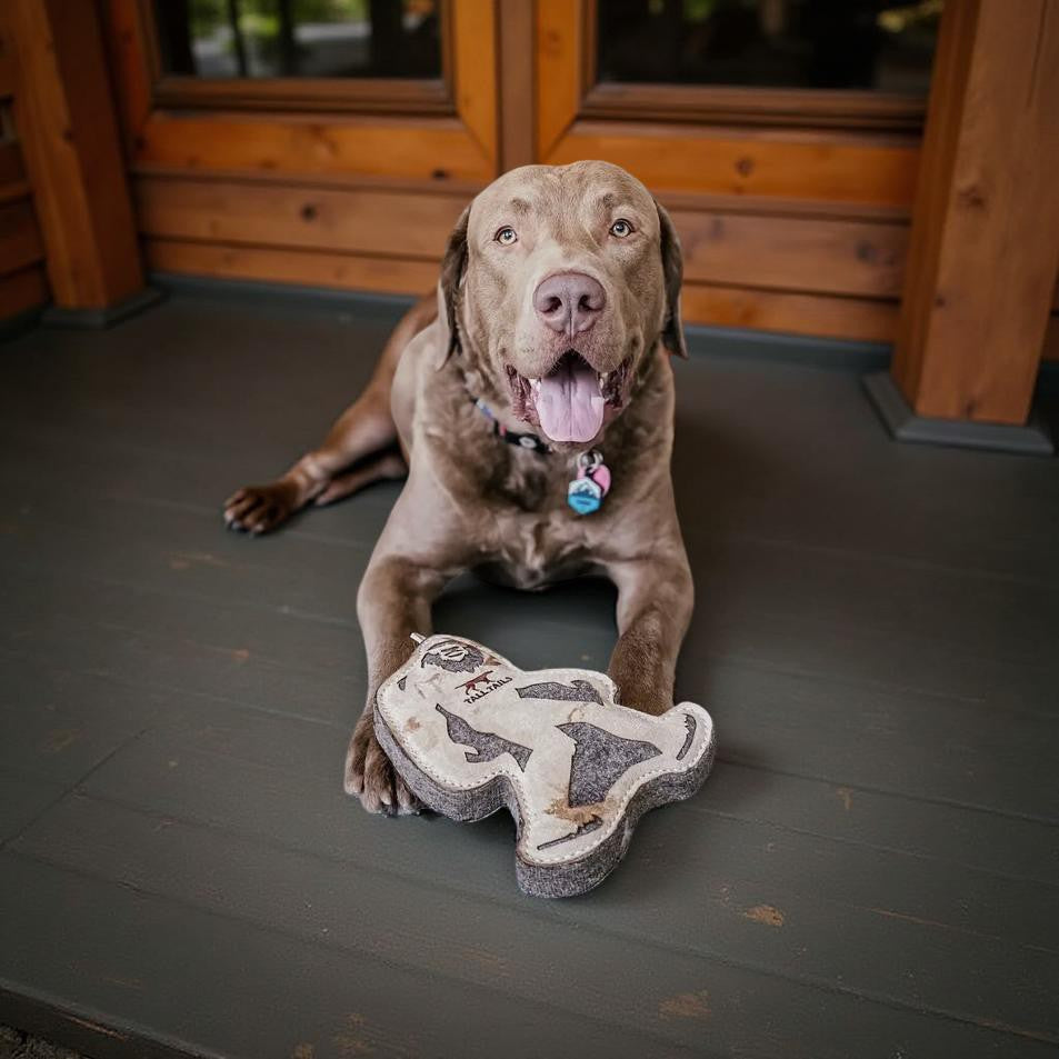 Forget flimsy fabrics. The Bigfoot is engineered from sturdy buffalo hide and backed by reinforced layers of natural wool-felt. These materials are heavy-duty stitched together, creating a thick, multi-layered profile that provides a satisfying "bite" for your dog while maintaining impressive structural integrity.